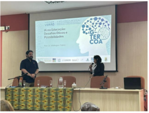 The lecture entitled “AI in Education: Ethical Challenges and Possibilities,” which addressed the topic from a socio-historical perspective, encompassing studies from the 20th century onwards, discussed the applicability of some AI tools for academic research, as well as the importance of implementing the Brazilian Artificial Intelligence Program (PBIA), which aims to transform the country into a protagonist in the field and not just a consumer of this technology, providing participants with a moment of valuable reflection.