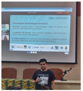 In the afternoon, at 2 PM, Professors Wellington Gabriel Freitas de Oliveira and André Santos Silva led the lecture “AI for data-driven formative assessment: possibilities and limitations of its use,” moderated by Professor [Name missing]. Dr. Amsranon Guilherme Felicio Gomes da Silva (SEDUC-CE). The discussion highlighted the potential, ethical challenges, and limitations of using data and algorithms in educational assessment processes.