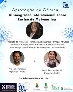 Data da publicação: 25 de abril de 2026 Categoria: 2026, NotíciasO Grupo de Estudos e Pesquisa Tecendo Redes Cognitivas de Aprendizagem (G-TERCOA/CNPq-UFC) tem a satisfação de parabenizar sua integrante, Profa. Esp. Franciliane Albuquerque Formiga, pela aprovação de seu trabalho no XI Congresso Internacional sobre Ensino de Matemática.