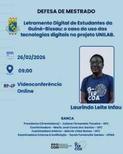 Data da publicação: 27 de fevereiro de 2026 Categoria: NotíciasO Grupo de Estudos e Pesquisa Tecendo Redes Cognitivas de Aprendizagem (G-TERCOA/CNPq/UFC) celebra a realização da defesa de dissertação de mestrado do pesquisador Laurindo Leite Infau, integrante do grupo, ocorrida no dia 26 de fevereiro de 2026, às 9h, em formato de videoconferência on-line, pelo Programa de Pós-Graduação em Comunicação (PPGCOM) da Universidade Federal do Ceará (UFC).