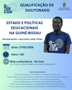 Data da publicação: 28 de fevereiro de 2026 Categoria: NotíciasO Grupo de Estudos e Pesquisa Tecendo Redes Cognitivas de Aprendizagem (G-TERCOA/CNPq/UFC) celebra a realização da qualificação de doutorado do pesquisador Laurindo Leite Infau, integrante do grupo, ocorrida no dia 27 de fevereiro de 2026, às 14h, por meio de videoconferência. Intitulada “Estado e Políticas Educacionais na Guiné-Bissau”, a pesquisa tem como objetivo compreender as dinâmicas que envolvem a formulação, implementação e os impactos das políticas públicas educacionais naquele país, evidenciando os desafios e as perspectivas para o fortalecimento do sistema educacional.